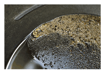 "DON'T PUT THE IRON SKILLET INTO THE WATER" Just dump the sand/salt "this fractures the attached Gold"...
