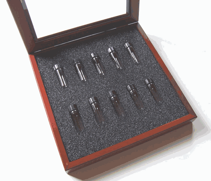 Our best selling display case style (Case #4) is pictured first and has 5 Glass Vials and 5 Gem Jars included. Our newest design comes with all vials - 5 one ounce vials and five 1/2 ounce vials (no gem jars). Also available are display cases with different sized jars, all gem jars or all vials in various configurations and sizes. Please email for more style pictures.